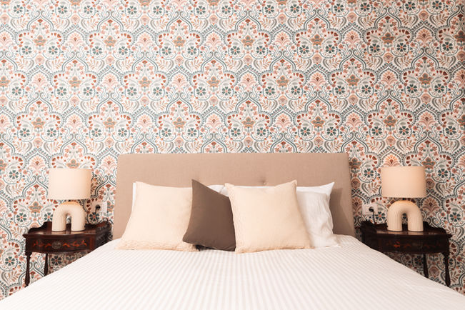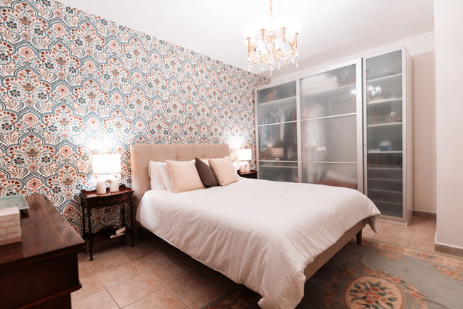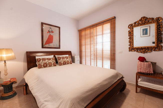 Located on the lower level, this peaceful and private room offers the perfect retreat after a day of exploring Tenerife. Featuring beautiful wallpaper, a comfortable Queen-size bed, and ample closet space, it’s designed for relaxation. A cozy study corner with a restored wood desk and classic books adds to the charm. The room also includes its own private bathroom for added comfort and privacy.