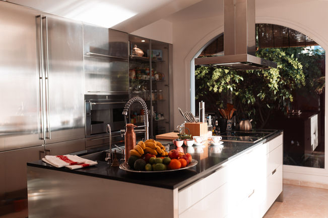 This modern open-plan, fully equipped kitchen features a sleek black stone island and stainless steel appliances, creating a stylish space for cooking and entertaining. A large window frames views of the manicured garden, bringing natural light into the heart of the home. The vibrant pop art pieces add a playful touch, perfectly complementing the kitchen’s contemporary design.