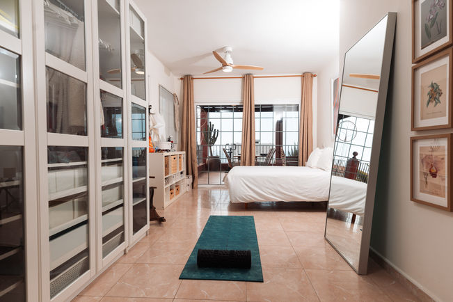 A blend of Asian heritage and modern elegance, the Master Bedroom features a large Qing Dynasty Ancestor Portrait and a 19th-century Chinese Apothecary Cabinet. The en-suite bathroom boasts a large bathtub and custom Frank Lloyd Wright-inspired stained glass windows. Step onto your private terrace for ocean views, perfect for intimate breakfasts or sunset moments with local wine and Canarian goat cheese.